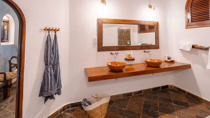 Two interconnected ground-floor bedrooms, each with air-conditioning, king-size bed, mosquito net, ceiling fan, and en-suite bathroom